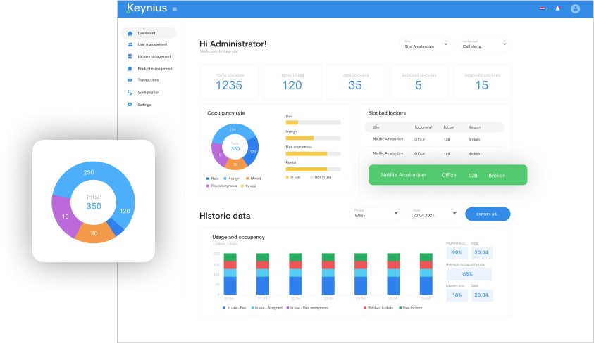 Being able to customize a solution to your specific needs and requirements is important. The Keynius Portal provides you with all the tools to configure the whole solution as you see fit. Furthermore the Portal is the ‘home’ for administrators, containing the most extended functionalities. The Portal additionally keeps track of important data - both historical as well as real-time - that can be used for data insight about the operation of lockers.