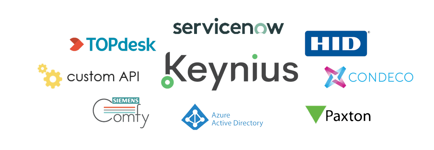 Keynius supports many API's to integrate with your existing software systems. Topdesk, iProtect (keyprocessor), Siemens Siport, AEOS, Azure Active Directory, Paxton, Loxis and Receptlocatie. We also offer tailored integrations.